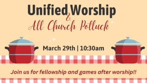 Unified Worship Service and Potluck March 29th 10:30 AM.